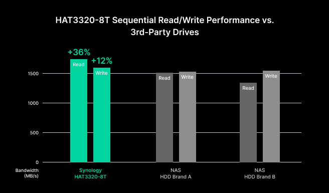 Together, these system and firmware-level enhancements deliver measurable performance gains over similar-class third-party drives in Synology systems: