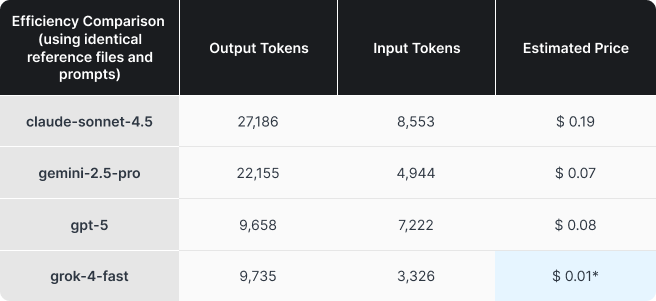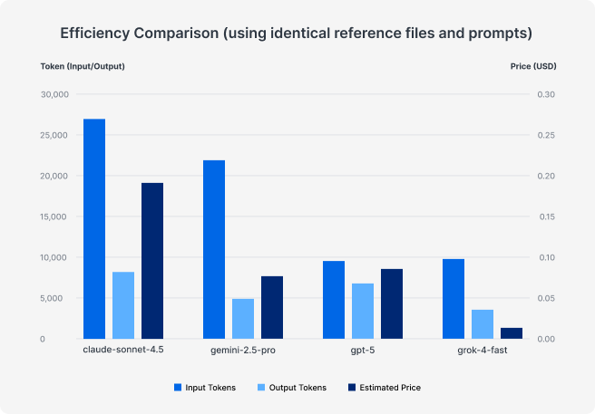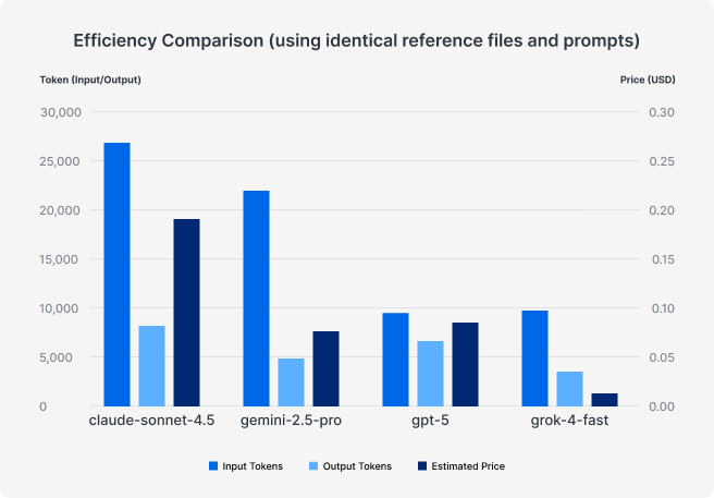 In our usage logs, we saw clear differences in how token-efficient each model ran, even when using the exact same prompt and reference files. Our tests ran with reasoning mostly disabled or set to the minimum amount possible, but the way a model works can still vary dramatically, especially due to how LLMs are inherently non-deterministic.
