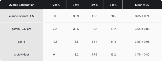 The top three are very close. Claude, Grok, and GPT clustered within a few hundredths of a point on our composite quality score. As expected for frontier LLMs, the differences will be relatively minor. What’s more interesting is that while GPT did edge out Claude in the final score by a hair, it received considerably more negative feedback.