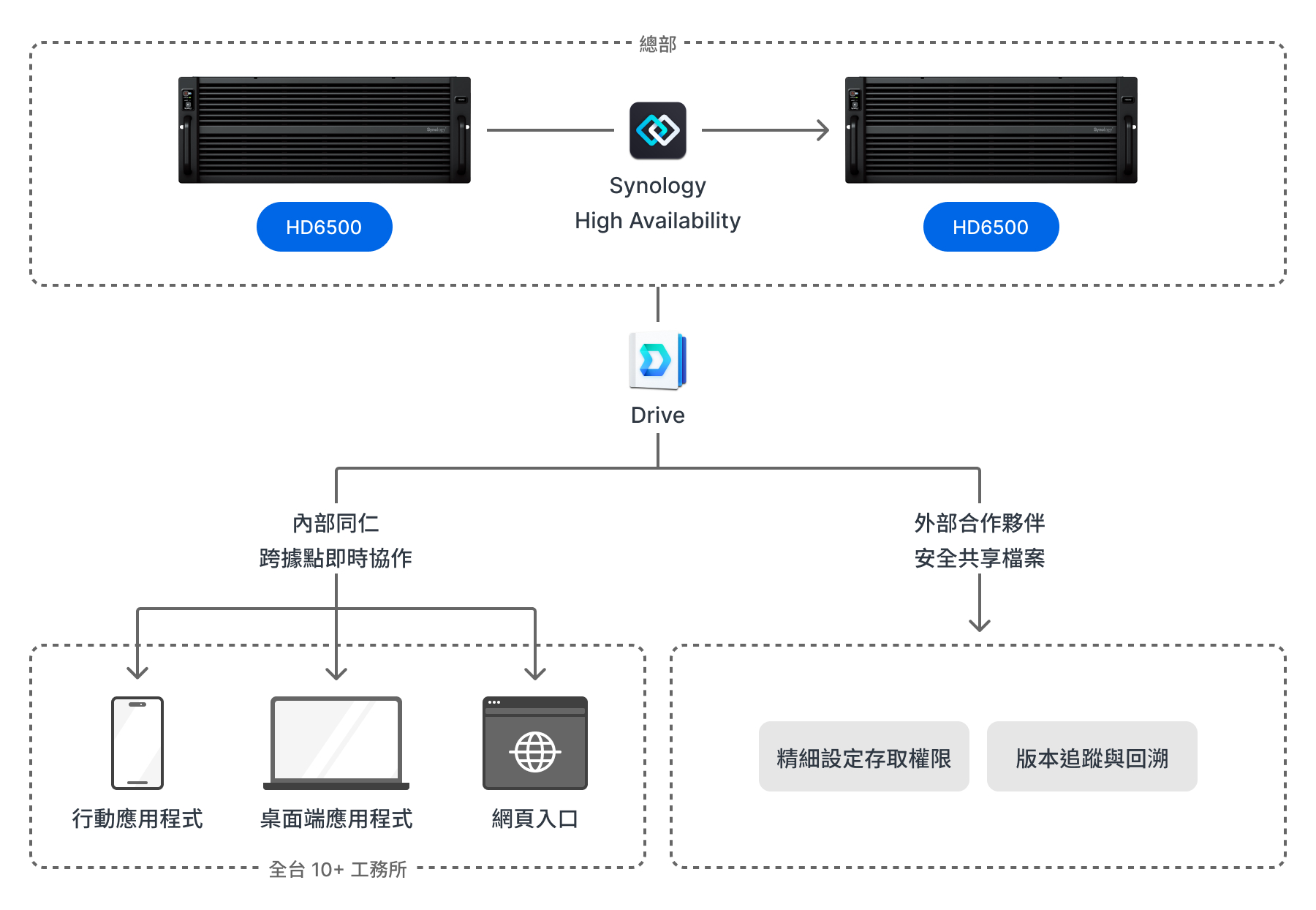 這間公司以 HD6500 作為核心儲存位置,統一承載所有工程專案的圖紙、模型、影像與文件。PB 級的擴充能力,讓專案檔案在同一架構下可以井然有序地歸檔,更不用擔心未來資料持續增長。為確保資料中心在繁忙工期之間保持穩定,還使用了 Synology High Availability 備援機制,即便遇到硬體故障,也能自動切換至備援主機,讓各個據點之間協作不中斷。