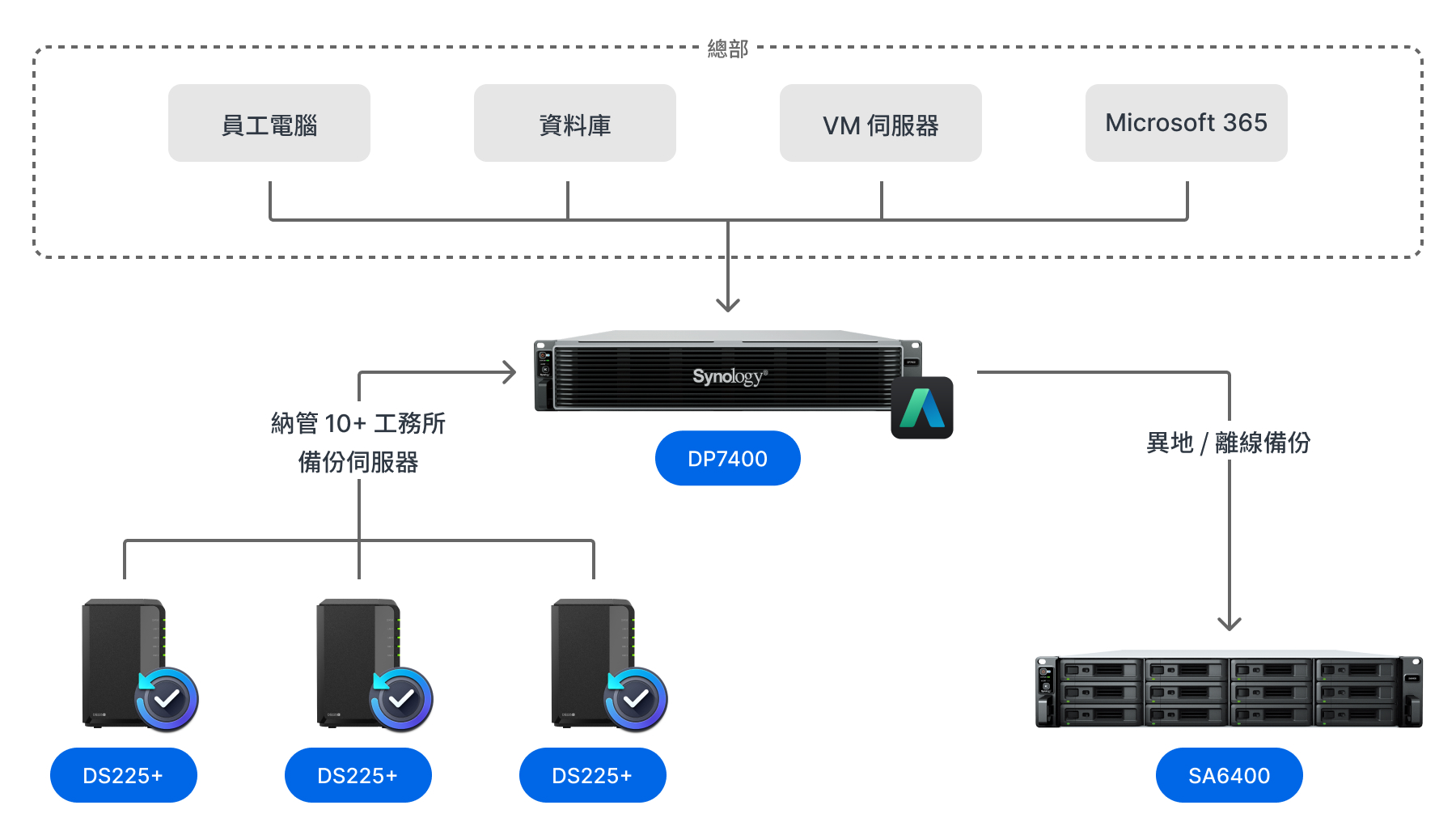 ActiveProtect 的另一大優勢,在於總部以外的備份資料,也能做到輕鬆且安全的管理。當前遍佈全台的工務所,皆有架設桌上型 NAS,以 Active Backup Suite 備份當地的裝置或影像,而 DP7400 可以集中納管位於異地的 Active Backup Suite,包含規劃排程、設定備份原則以及監控任務狀態,而當特定工務所遺失資料時,就能從總部即時還原資料,大幅縮短營運中斷時間。
