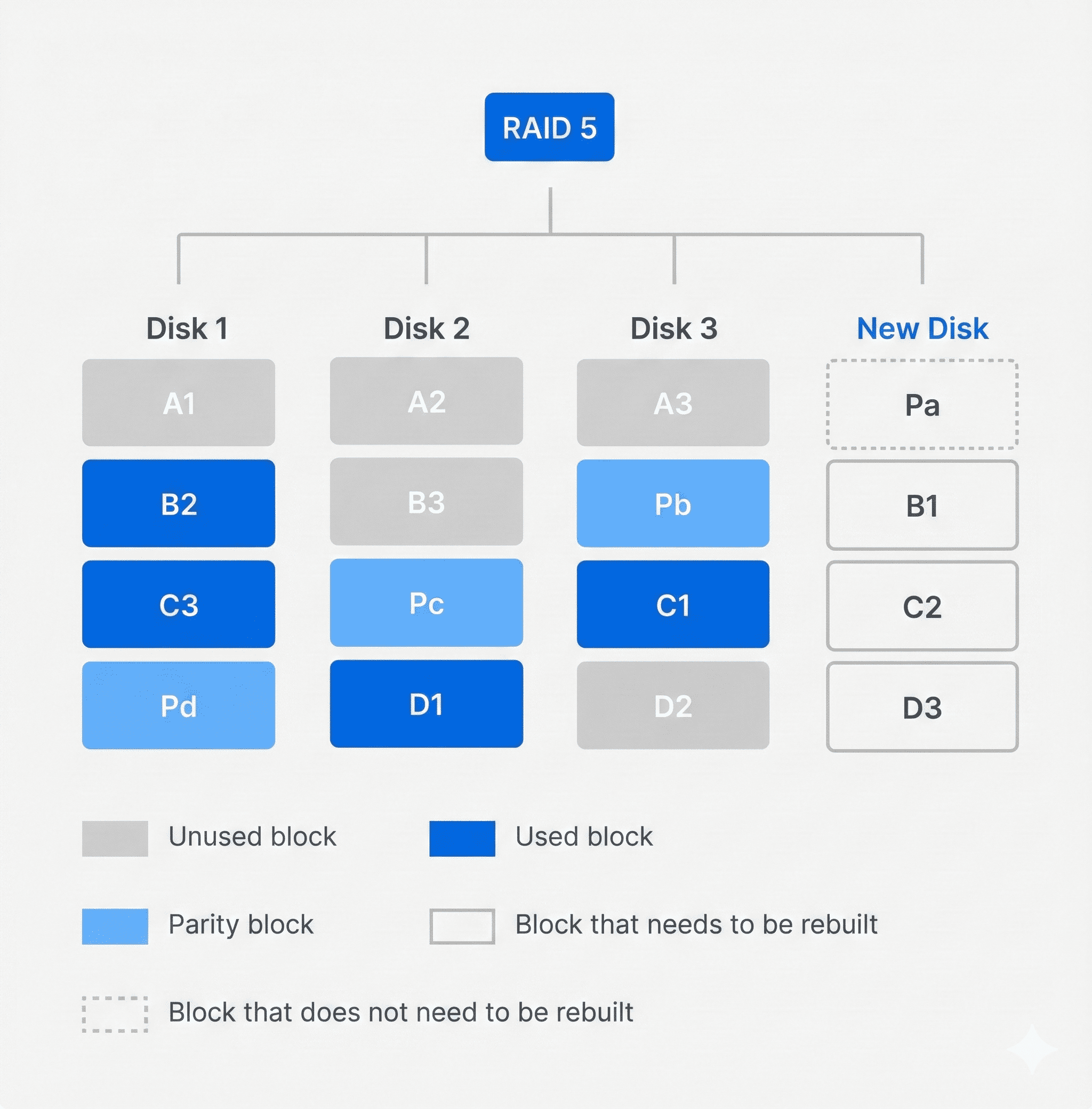 另外,資料重建期間 RAID 陣列中其他完好硬碟,不可避免會承受更大的負載,萬一這段時間因負載增加、可用硬碟也跟著故障,並超過該 RAID 陣列容錯的硬碟顆數時,整個儲存空間就會毀損,無法完整復原資料。