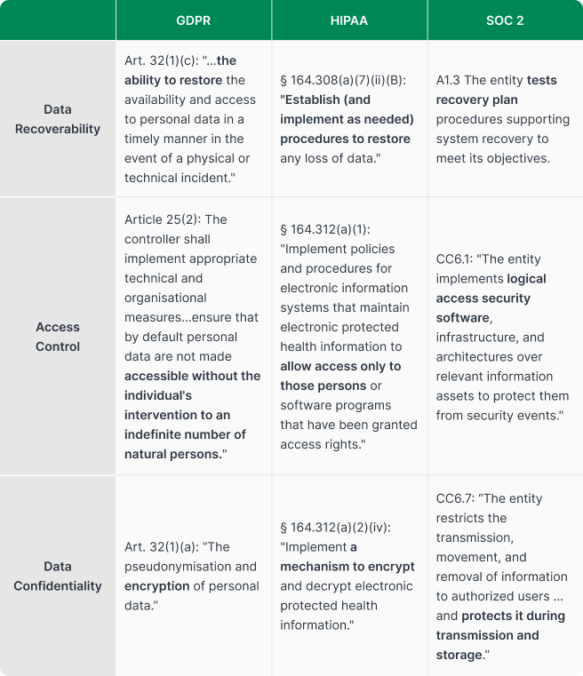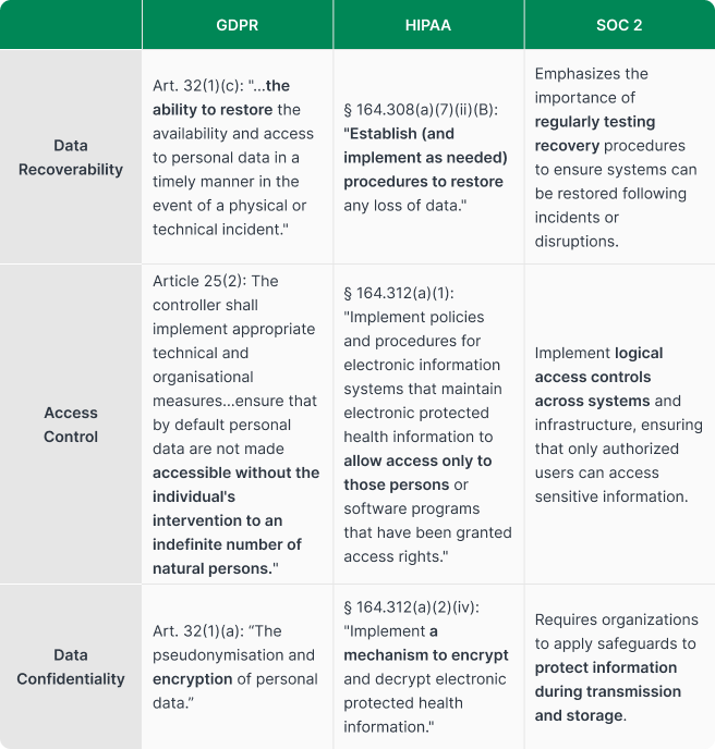 Although each regulation is defined differently, they ultimately demand the same outcome. Using GDPR, HIPAA, and SOC 2 as examples, the specific provisions vary, but the core control requirements largely overlap.