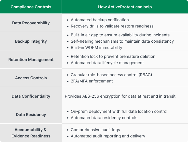 ActiveProtect protects backup data with WORM to prevent unauthorized modification or deletion. For additional protection, backup copies transferred to remote storage are secured with AES-256 encryption both in transit and at rest, while remaining immutable. This layered design protects sensitive data from unauthorized disclosure, deletion, and modification, while meeting compliance requirements without compromising enterprise RTO objectives. Click here to learn how ActiveProtect integrates both.