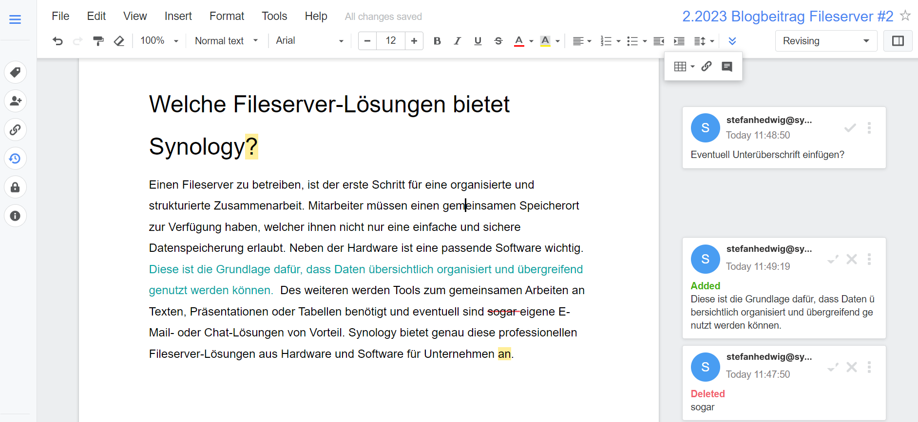 Die Möglichkeit gemeinsam in Echtzeit zusammenarbeiten zu können, ist für viele Unternehmen der Hauptgrund, sich einen Fileserver anzuschaffen. Doch durch das hoch- und herunterladen von Daten und das lokale Bearbeiten, können schnell Fehler passieren, indem z.B. ein Kollege die Änderungen eines anderen überschreibt. Mit der Applikation Synology Office passiert das nicht. Damit können Nutzer Dokumente, Tabellen und Präsentationen gemeinsam über den Browser bearbeiten, ohne sie immer hoch- und herrunterladen zu müssen. Denn Echtzeit bedeutet hier wirklich Echtzeit: Das heißt, wenn sich 2 Benutzer in deinem Dokument aufhalten, sehen sie den Cursor und die eingetippten Buchstaben des jeweiligen anderen Nutzers. Auf diese Weise wird nichts überschrieben und es geht auch nichts verloren. Zudem können Nutzer Kommentare für Kollegen hinterlassen oder Korrekturen vornehmen und verfolgen. Genauso, wie man es von anderen Cloud-Anbietern kennt.