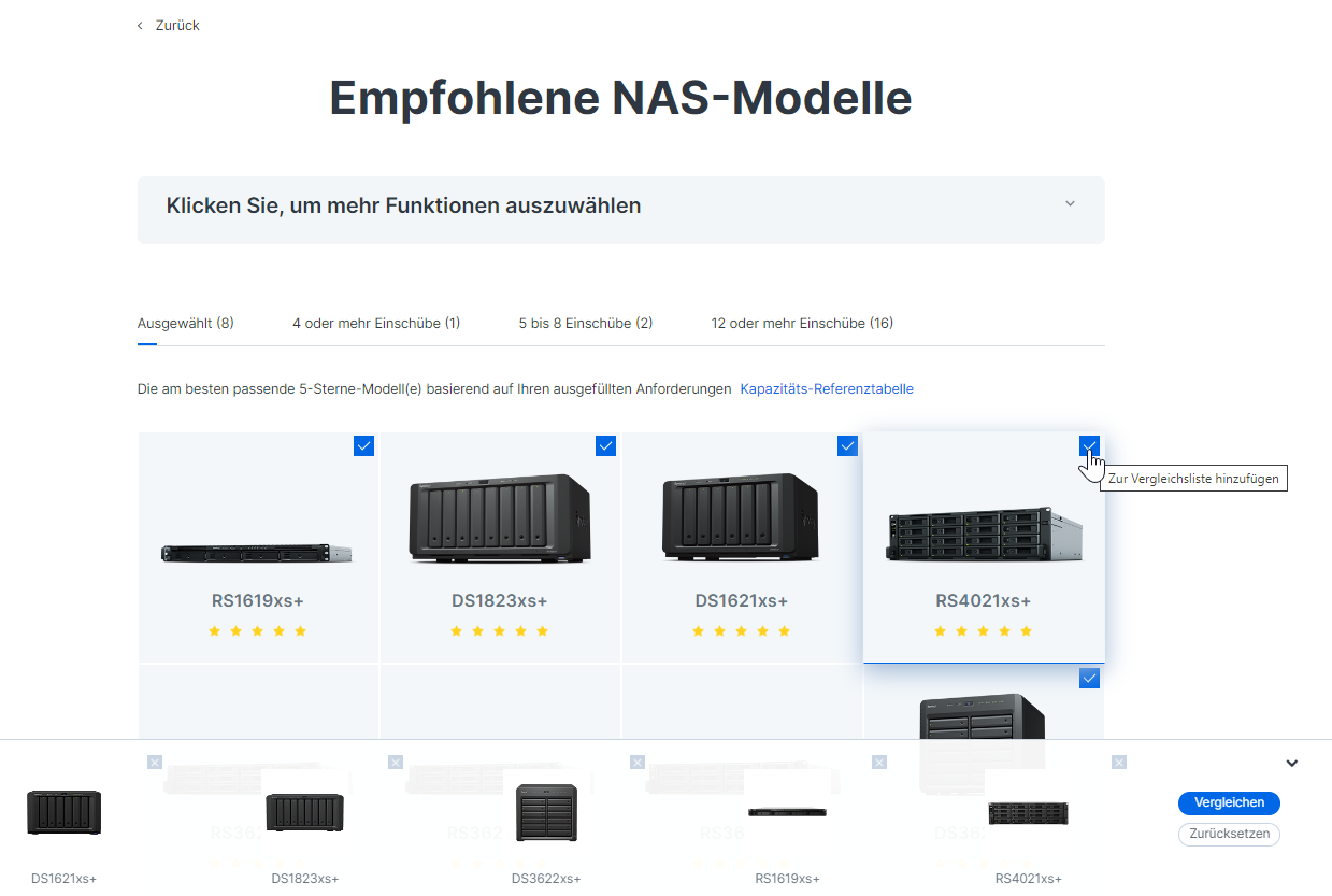 Damit Nutzer sich nicht durch über 40 Geräte kämpfen und diese manuell vergleichen müssen, stellt Synology den NAS-Berater zur Verfügung. Mit diesem Tool erhält jedes Unternehmen – ob Startup, KMU oder Großkonzern – eine erste NAS-Empfehlung für seinen Fileserver. Diese Empfehlungen können dann nach weiteren Funktionen gefiltert und miteinander verglichen werden.