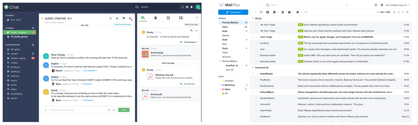 Für eine reibungslose Zusammenarbeit bedarf es auch einer schnellen Kommunikation. Bei ausführlichen Themen ist die E-Mail das passende Tool. Bei kurzen Rückfragen, die eine schnelle Antwort benötigen, ist ein Chat besser geeignet. Beides kann direkt zusammen mit dem Fileserver auf dem Synology NAS laufen.