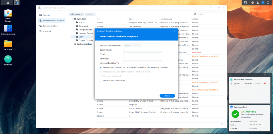 Unternehmen können auf ihr Synology NAS/SAN mit der Applikation Synology Directory Server einen Domain Controller einrichten. Dadurch können Administratoren Updates und Richtlinien für mehrere Benutzer und Endgeräte gleichzeitig bereitstellen sowie Domainobjekte nach eigenen Präferenzen konfigurieren. Das spart bei großen Installationen viel Aufwand und Zeit. Zudem bietet es eine universelle Authentifizierung, welche Synology-, Windows, Mac- und Linux-Plattformen unterstützt.