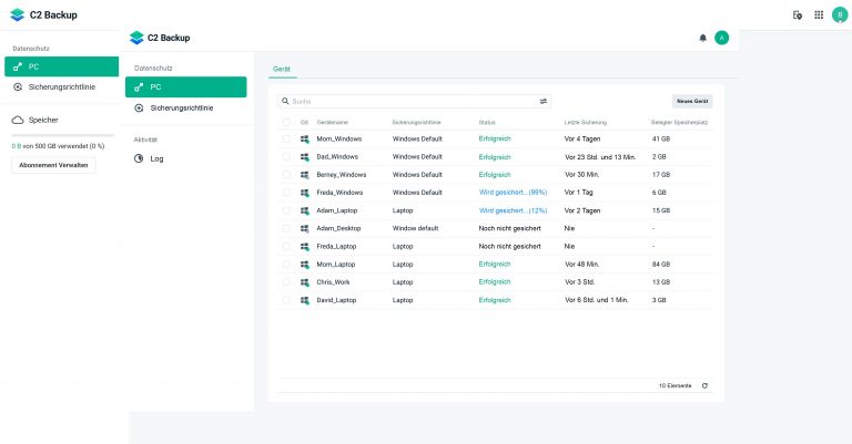 Wir wissen, dass es wichtiger ist, Daten von mehreren Geräten aus zu sichern als unbegrenzten Speicherplatz zu haben. Da die meisten von uns täglich mit zwei oder mehr Rechnern, privat und beruflich, jonglieren, unterstützt C2 die Möglichkeit Backups von einer unbegrenzten Anzahl von Geräten zu erstellen. So hat man eine einzige zentrale Kontrollstelle für alle seine Daten.