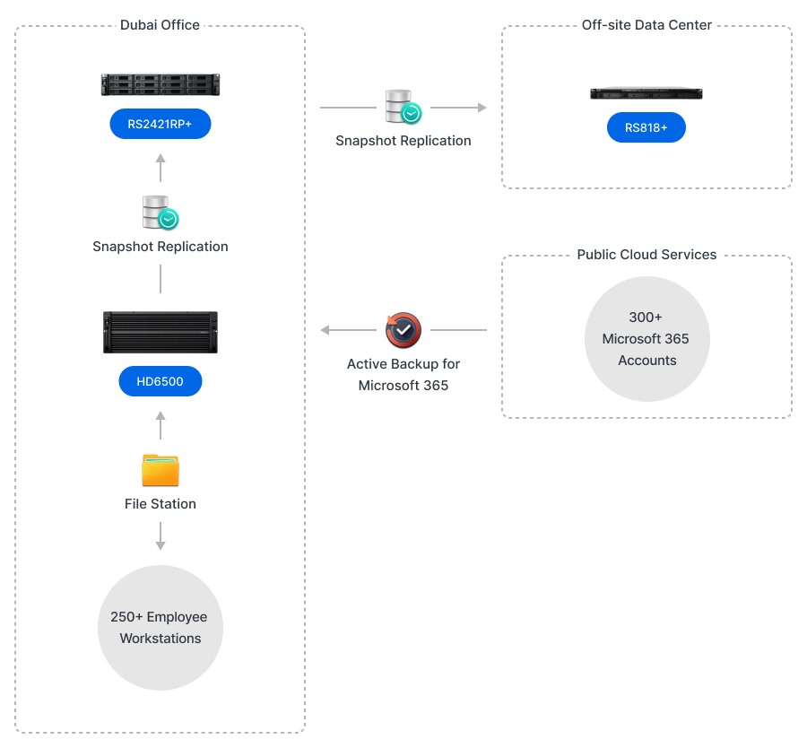 Zudem konnte das Unternehmen mit den Lösungen von Synology eine zuverlässige Backup-Strategie gemäß der 3-2-1 Regel implementieren.