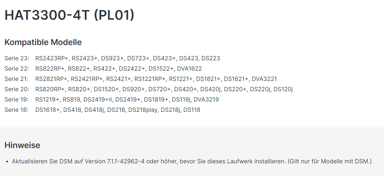 Nein, die Plus HDDs werden ausschließlich mit Desktop- und Rack-Modellen der Plus-Serie sowie mit DiskStations der Value- und J-Serie und der DVA kompatibel sein. Für die 4 TB Plus HDDs sind folgende Modelle kompatibel: